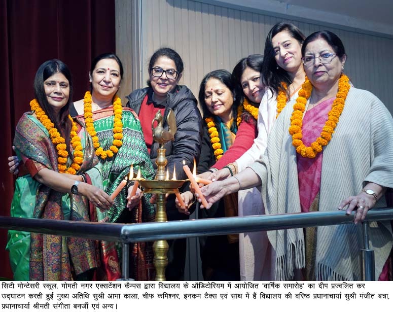लखनऊ, 24 दिसम्बर। सिटी मोन्टेसरी स्कूल, गोमती नगर एक्सटेंशन कैम्पस द्वारा विद्यालय के ऑडिटोरियम में आयोजित ‘वार्षिक समारोह’ में अपने नाचते-गाते बच्चों की बहुमुखी एवं बाल सुलभ प्रतिभा को देखकर अभिभावक गदगद हो गये। कार्यक्रम में भारी संख्या में उपस्थित अभिभावकों ने अपने नन्हें-मुन्हों की खूब हौसलाअफजाई की और बच्चों ने भी बड़े उत्साह से अपनी प्रतिभा का प्रदर्शन किया। इससे पहले मुख्य अतिथि सुश्री आभा काला, चीफ कमिश्नर, इनकम टैक्स, ने दीप प्रज्जवलित कर समारोह का विधिवत उद्घाटन किया।
